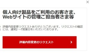 - ポップで表示された「個人向け製品をご利用のお客さま、Webサイトの管理ご担当者さま等」の「評価内容変更のリクエスト」を選択